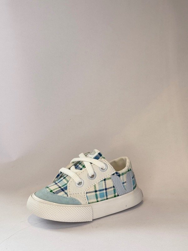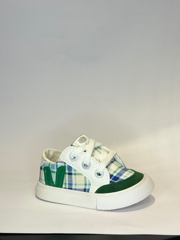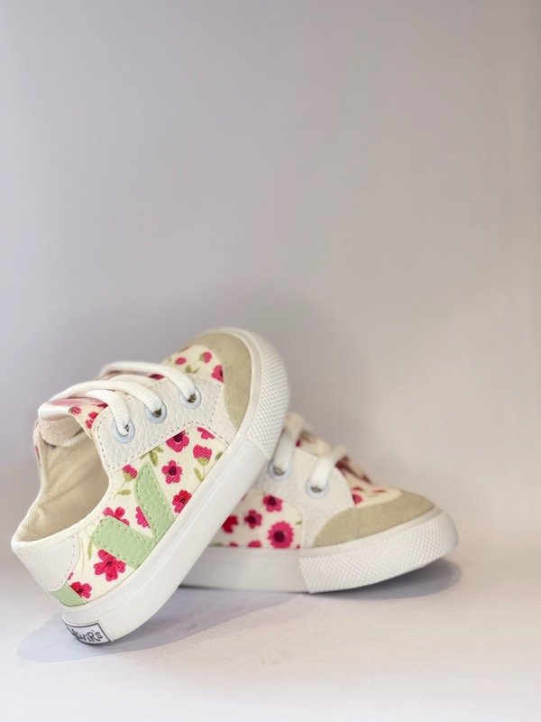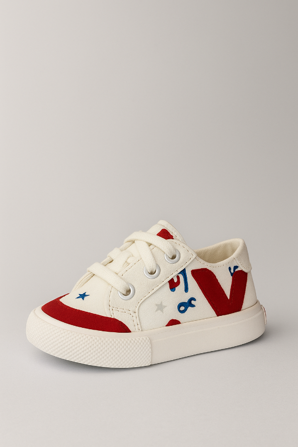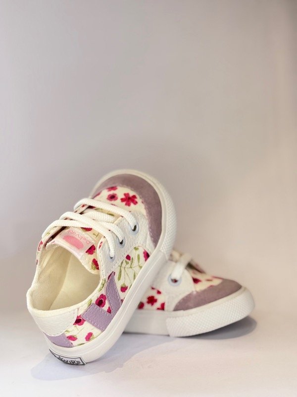 Zapatilla en gabardina estampada con puntera de gamuza y apliques en ecocuero, suela antideslizante.