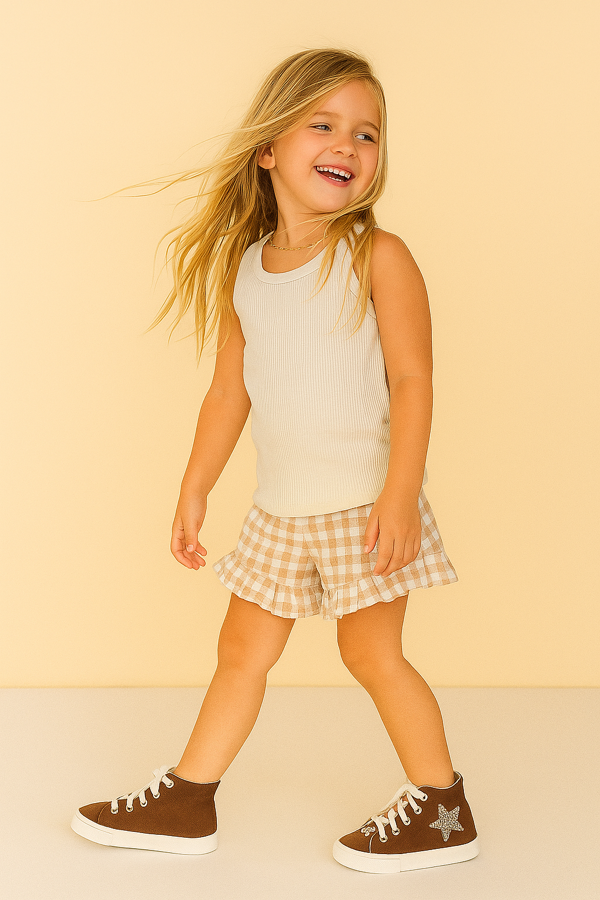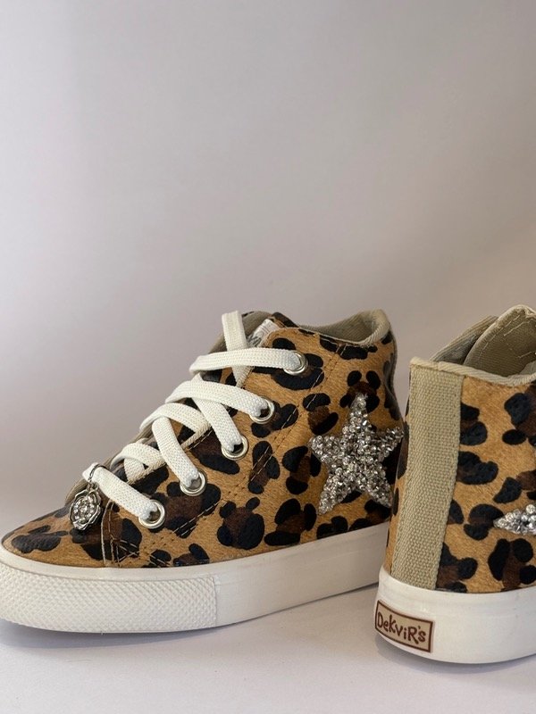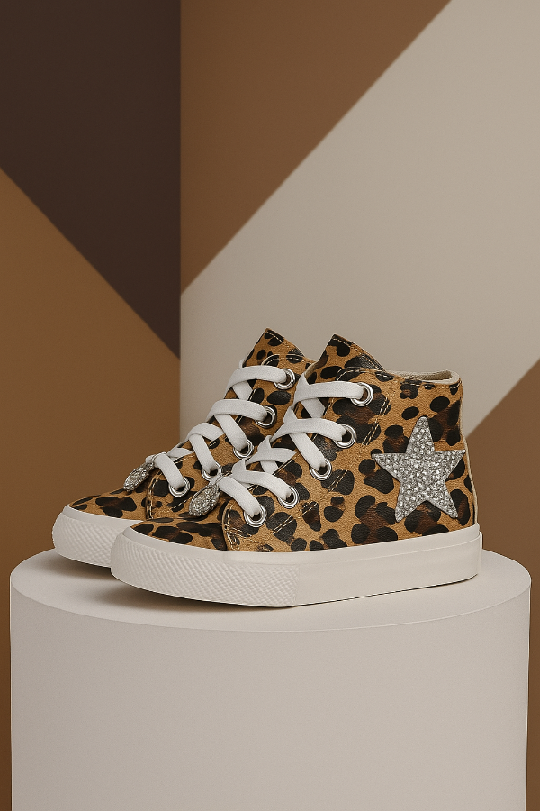 Bota de ecocuero o lona (según color) con aplique de glitter lateral, cordón blanco y charm para colgar.
