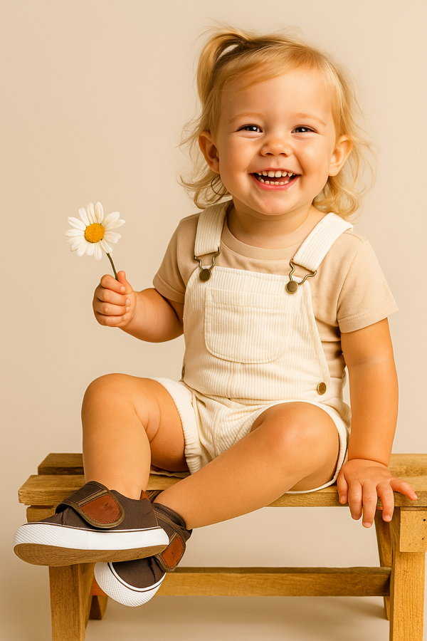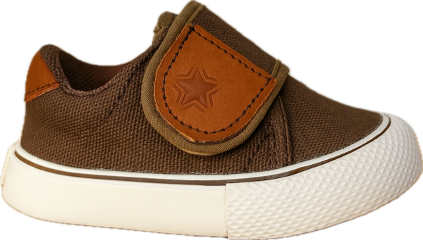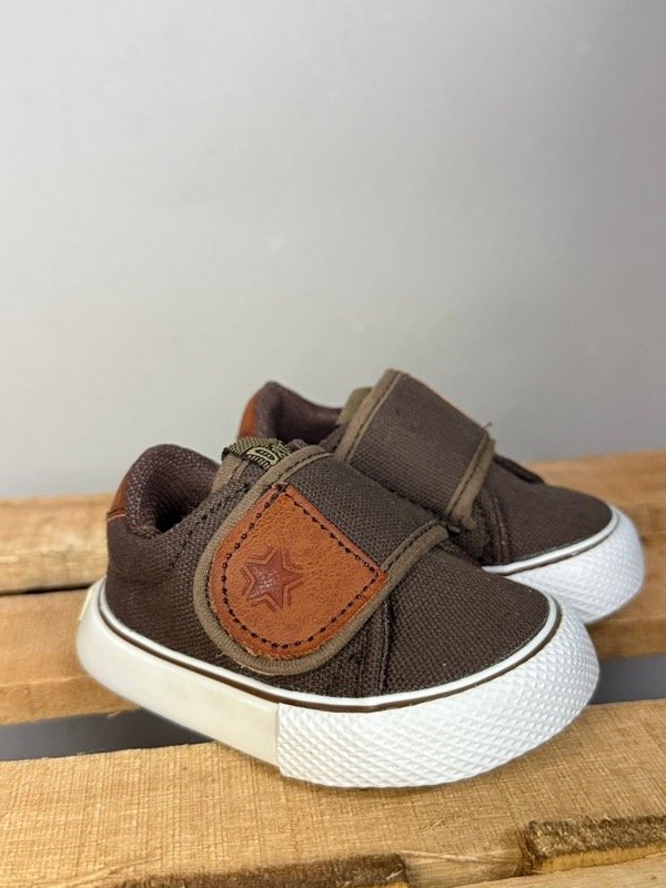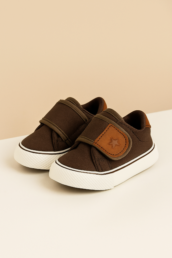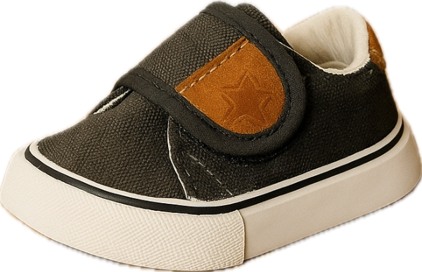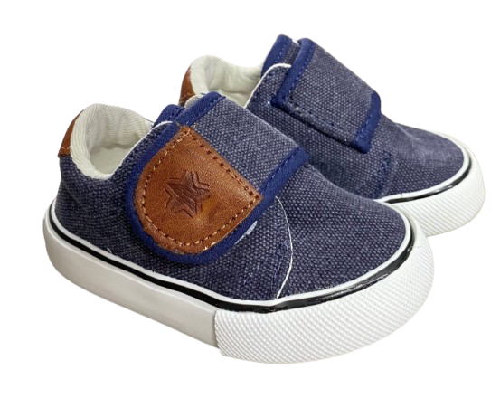 Zapatilla de lona con abrojo ancho y aplique en ecocuero grabado, suela antideslizante.