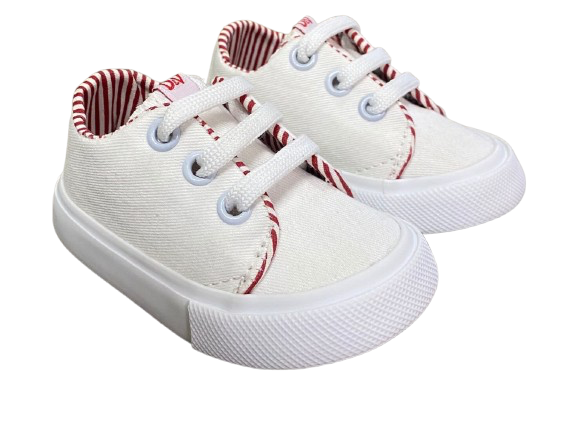 Zapatilla en gabardina con forro rojo rayado, suela antideslizante.
